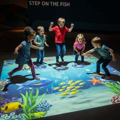 물고기를 밟는 것은 우리의 블록버스터 히트입니다. 프로젝터는 생생한 수중 장면을 시전합니다 - 생선 활공, 거품 거품, 파도가 흔들립니다. 당신의 임무? 미끄러운 수영 선수들에게 스플래시 사운드와 회피 조작으로 완성되도록 "잡기"를 위해 밟습니다.